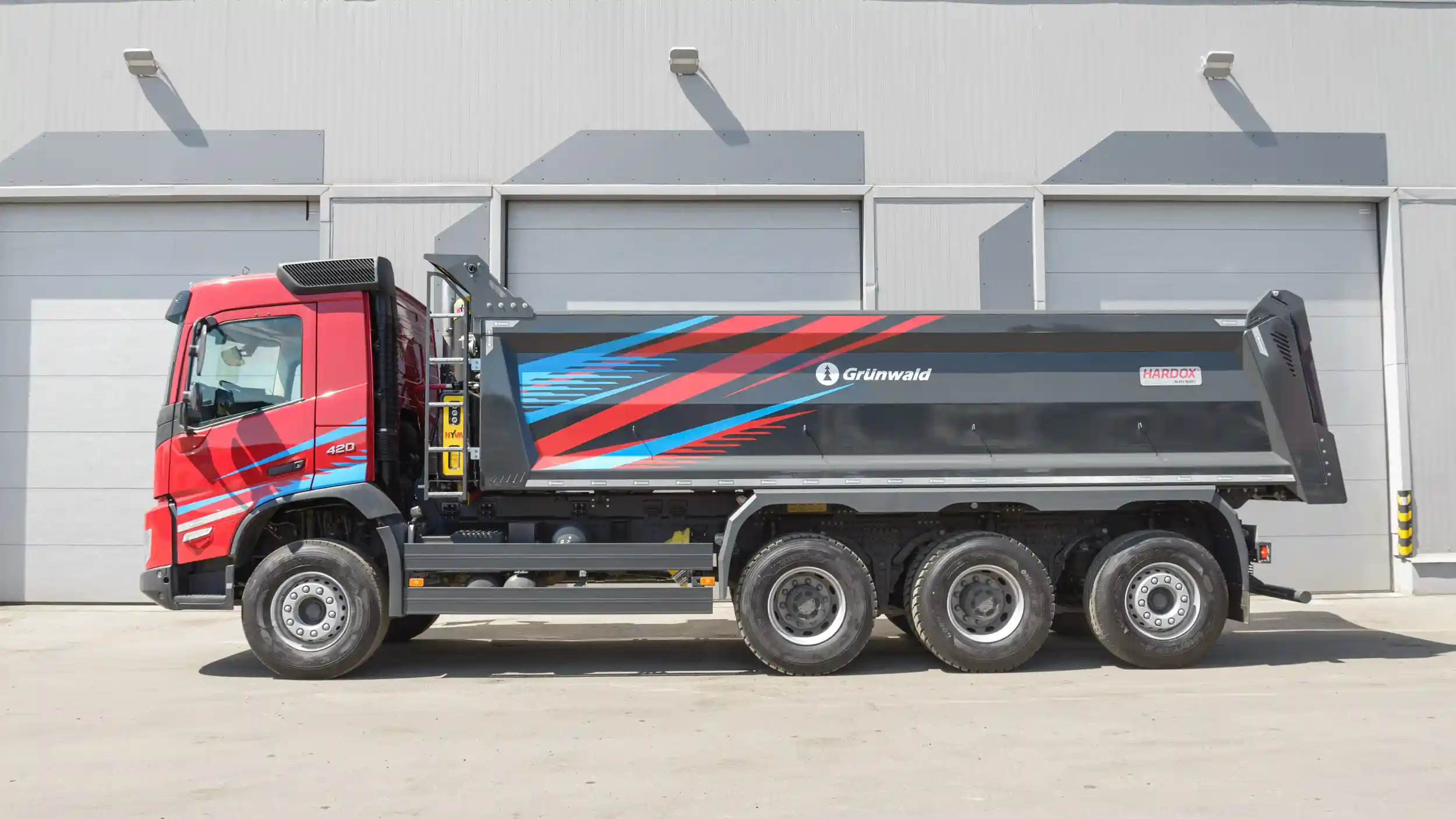 Основой автомобиля стало скандинавское шасси VOLVO FMX 420 HP 8*4 Rigid Tag Tridem, в конструкции которого поддерживающая ось с подъемным механизмом располагается позади двух ведущих осей. Укомплектованный кузовной надстройкой Grunwald объемом 20 куб.м, автомобиль призван решать задачи строительного самосвала городского цикла. Его маневренность позволяет работать на узких городских улицах и небольших разгрузочных площадках, при этом он способен доставлять значительный объем груза за один рейс.